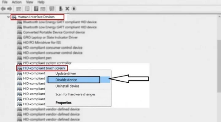 - Tìm thiết bị có tên chứa“HID-compliant touch screen”hoặc“Touch Screen”