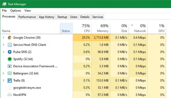 Để khắc phục tình trạng này, hãy hạn chế sử dụng nhiều các phần mềm không cần thiết cùng lúc, đóng các chương trình nặng (như game, phần mềm chỉnh sửa video, đồ họa…) sau khi sử dụng xong. Để kiểm tra kỹ hơn và tắt đúng các phần mềm, hãy mở Task Manager với tổ hợp phím Ctrl + Shift + Esc sau đó chọn More Details (nếu chưa mở rộng cửa sổ) và chọn tab Processes để xem những ứng dụng gì đang hao tài nguyên nhất (vd như cái nào đang chiếm % CPU và %RAM nhiều). Nếu như đó là ứng dụng không cần thiết ngay, hãy tắt đi bằng cách nhấp chuột chọn ứng dụng sau đó chọn End Task.