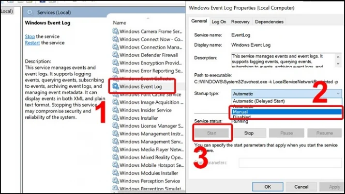 Bước 3:Sau đó, bạn click đúp chuột vào mụcWindows Event Log. Tiếp theo, bạn lần lượt chọn vàoStartup type >>Nhấn nútStartđể chạy là xong.