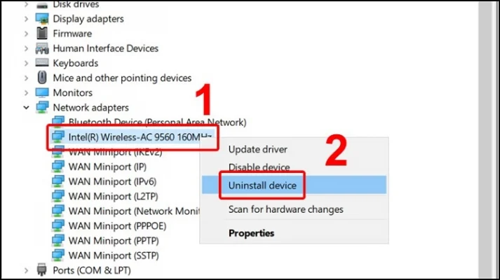 Bước 3:Hãy click chuột phải lênWireless. ChọnUninstall deviceđể tiếp tục.
