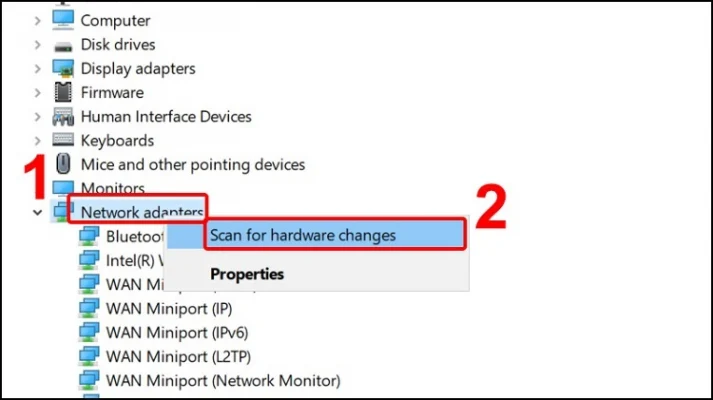 Bước 4:Tiếp theo, click chuột phải vào mụcNetwork adapters. Ngay sau đó, hãy click vào mụcScan forhardware changesđể laptop tự động dò tìm, cài đặt mới.