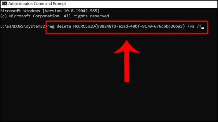Bước 6:Tại giao diện mới, bạn nhập vào lệnh“reg delete HKCRCLSID{988248f3-a1ad-49bf-9170-676cbbc36ba3} /va /f”. Nhấn phímEntertrên để tiếp tục.