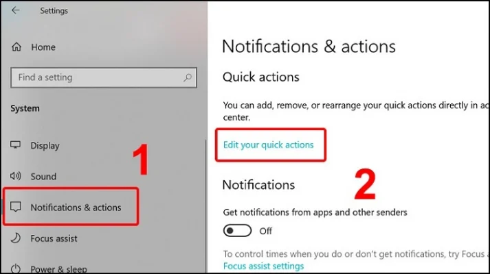 Bước 3:Tạitab Notifications & actions, bạn hãy chọn vào mụcEdit your quick actions.