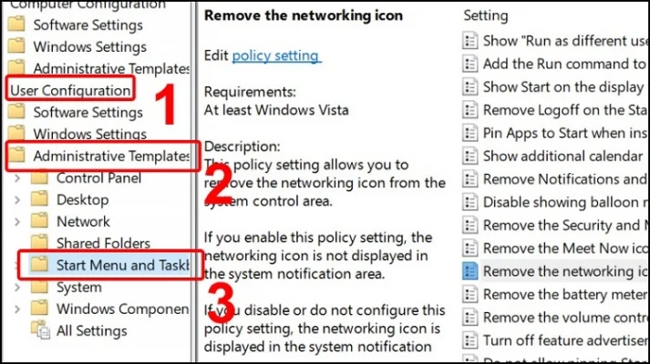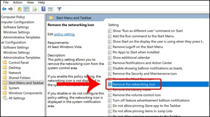 Bước 4:Tại cửa sổ mới, bạn click đúp chuột vào mụcRemove the networking icon.