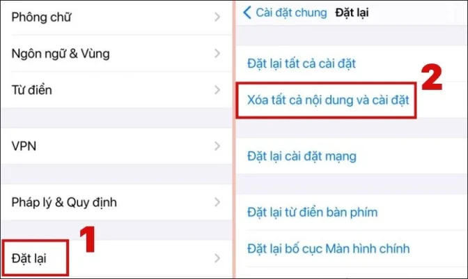 Bước 2:Trong giao diện vừa hiện ra, bạn ấn vàoĐặt lại. Lúc này, hãy chọnXóa tất cả nội dung và cài đặtđể reset lại cài đặt ban đầu.