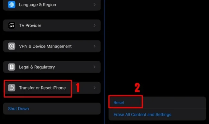 Bước 2:Cuộn xuống phía dưới cùng của màn hình và nhấn vàoTransfer or Reset iPhone. Tiếp đó, ở màn hình tiếp theo, chọn dòng chữResetmàu xanh.