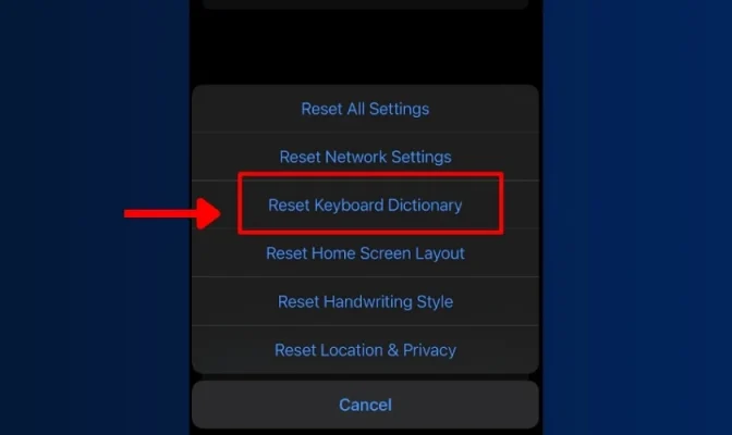Bước 3:Một danh sách các tùy chọn đặt lại sẽ hiện ra. Tại đây, hãy cẩn thận chọn đúng mụcReset Keyboard Dictionary.