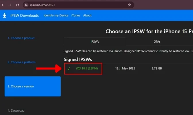 Bước 3:Trang web sẽ liệt kê các phiên bản firmware có sẵn. Hãy tìm đến mục Signed IPSWs. Nếu bạn thấy phiên bản iOS 18 có dấu tích màu xanh lá cây bên cạnh. Hãy nhấn vào phiên bản đó để tải tệp tin về máy.