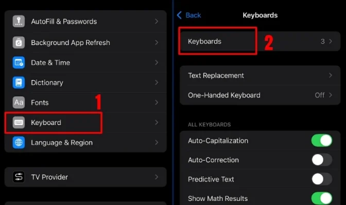 Bước 2:Bạn tiếp tục chọn mụcKeyboardvà ở dòng trên cùng, nhấn vàoKeyboards. Thao tác này sẽ hiển thị tất cả các bộ gõ ngôn ngữ đang được cài đặt trên iPhone của bạn.