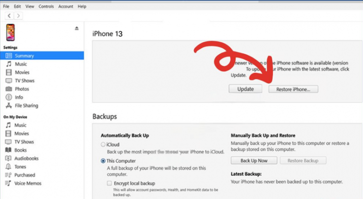Nếu lỗi xuất phát từ phần mềm nhưng việc khởi động lại không hiệu quả, bạn có thể khôi phục cài đặt gốc thông qua iTunes. Cách này sẽ xóa sạch hệ điều hành hiện tại và cài đặt lại một phiên bản ổn định hơn. Tuy nhiên, hãy sao lưu dữ liệu trước khi thực hiện.