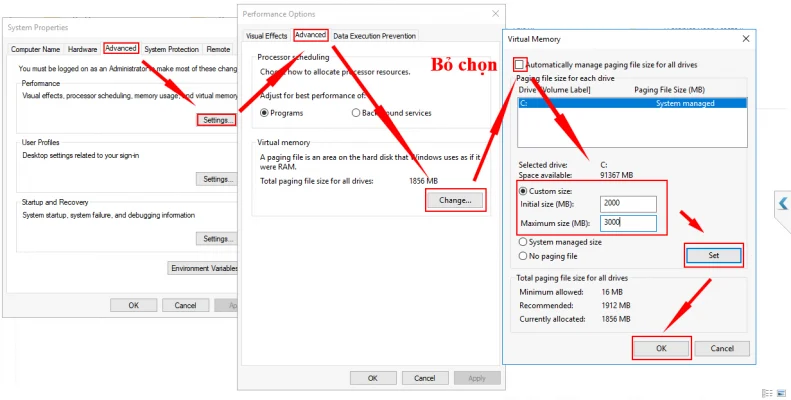 - Chuyển Virtual Memory sang ổ đĩa khác nếu có SSD