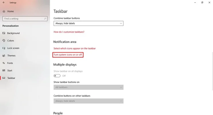 - Bước 3:Tiếp theo, chọnTaskbar, sau đó cuộn con trỏ xuống, chọnTurn system icon on or off