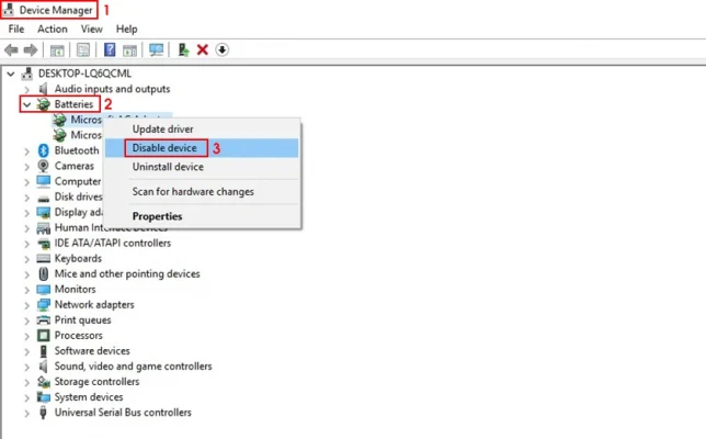 - Bước 6:Tiếp theo, tại của sổComputer ManagementchọnDevice Manager– >Batteries. Sau đó, click chuột phải, chọnDisablecả 2 thẻ