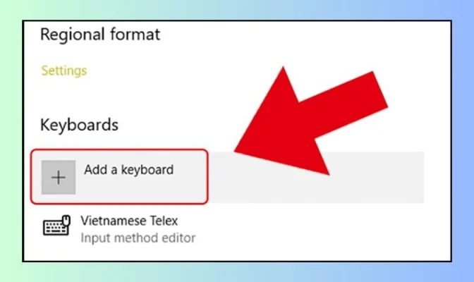 Bước 6:Kéo xuống phầnBàn phím. Mặc định sẽ có kiểu gõTelex. Nếu muốn đổi sang kiểu gõVNI, hãy nhấnThêm bàn phím (Add a keyboard).