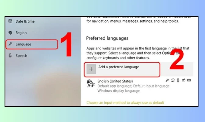 Bước 3:Tiếp tục chọn phầnNgôn ngữ (Language), rồi tại mụcNgôn ngữ ưu tiên (Add a preferred language), hãy nhấn nút Thêm ngôn ngữ.