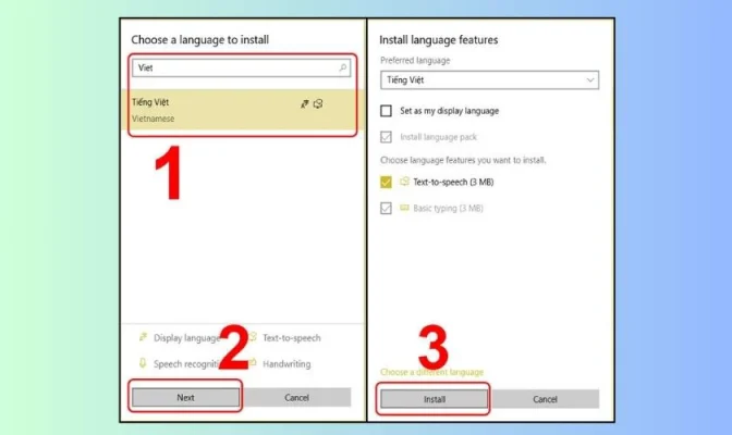 Bước 4:Gõ từTiếng Việtvào thanh tìm kiếm trong phần lựa chọn ngôn ngữ để cài đặt. Khi thấy Tiếng Việt, bấm chọn rồi nhấnTiếp theo(Next)và sau đó nhấnCài đặt (Install). Đợi hệ thống hoàn tất việc thêm ngôn ngữ.