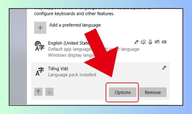 Bước 5:Khi Tiếng Việt đã được thêm vào, chọn nó rồi nhấn vàoTùy chọn (Options).