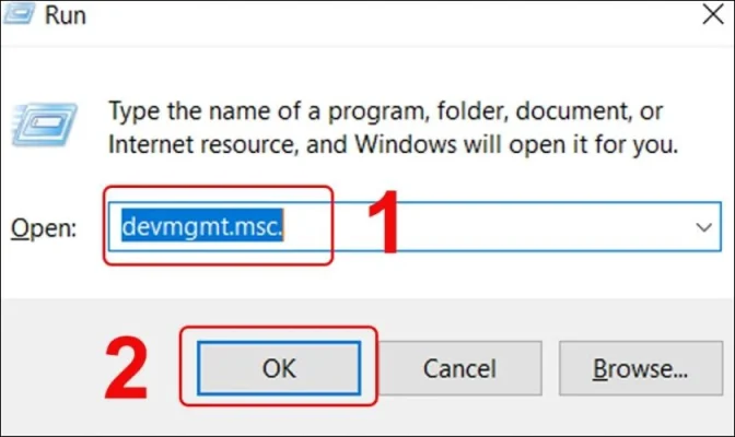 Bước 1:Nhấn tổ hợp phímWin + Rvà gõdevmgmt.msc. Sau đó nhấnOKđể mở Device Manager.