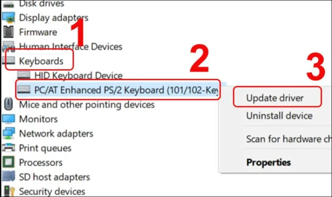 Bước 2:ChọnKeyboard, nhấpchuột phảivàoPC/AT Enhanced PS/2 Keyboard. Cuối cùng, chọnUpdate driver.