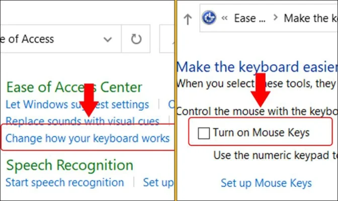 Bước 3:ChọnChange how your keyboard works, rồi bỏ chọnTurn ON Mouse Keys.