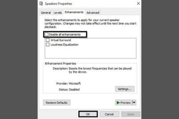 Một vấn đề có thể dẫn đến tình trạng laptop không có âm thanh là tính năng Enhancements giúp tăng thêm tiếng bass của máy tính, nhưng đôi lúc nó sẽ có thể xung đột với các thành phần khác. Để khắc phục sự cố loa không hoạt động thì bạn có thể chuyển đến Speakers Properties > sau đó tắt đi tất cả cải tiến từ đây là được.