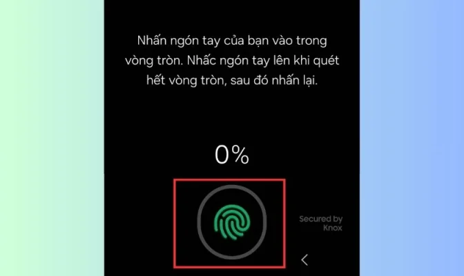 Bước 5:Lúc này nhấn ngón tay của bạn vào trong vòng tròn. Nhấc ngón tay lên khi quét hết vòng tròn, sau đó nhấn lại đến khi màn hình hiển thị 100%.