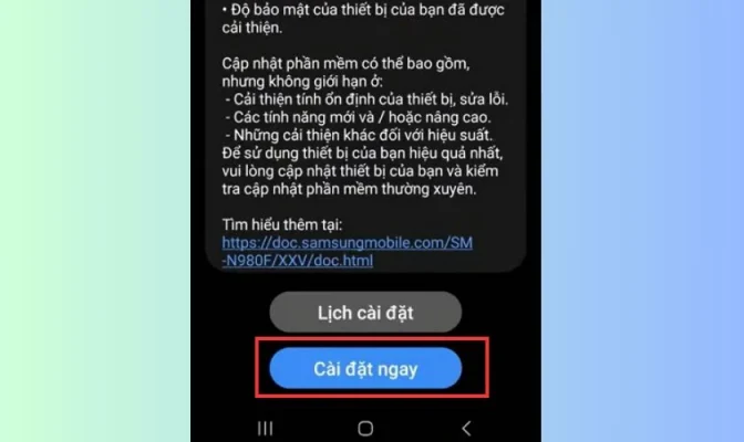 Bước 2:Điện thoại sẽ tự động kiểm tra phiên bản Android mới nhất. Nếu có bản cập nhật, bạn hãy chọnCập đặt ngayđể cài đặt phần mềm mới nhất.