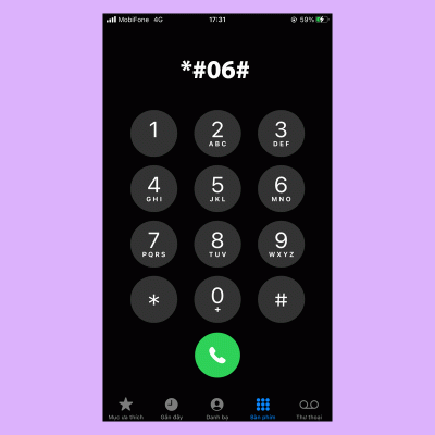 Bên cạnh đó, bạn còn có thể thực hiện trực tiếp bằng việc nhập cú pháp số *#06#vào ứng dụngĐiện thoạicủa iPhone. Hệ thống sẽ ngay lập tức đưa kết quả số IMEI thiết bị của bạn.