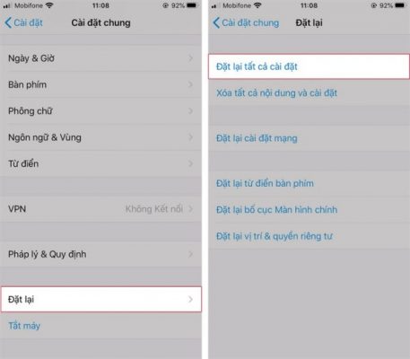 Để đặt lại cài đặt mạng, bạn vàoCài đặt => Cài đặt chung => Đặt lại.Tại đây, bạn chọn Đặt lại cài đặt mạng. Nếu không thành công, bạn chọnĐặt lại tất cả cài đặt.