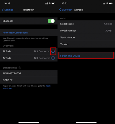 Ngoài ra, bạn cũng có thể vàoCài đặt => Bluetooth =>Nhấn vào biểu tượng chữ“i”vào bên cạnh thiết bị bạn muốn kết nối =>Quên thiết bị này. Sau đó, bạn hãy thử kết nối lại xem sao.